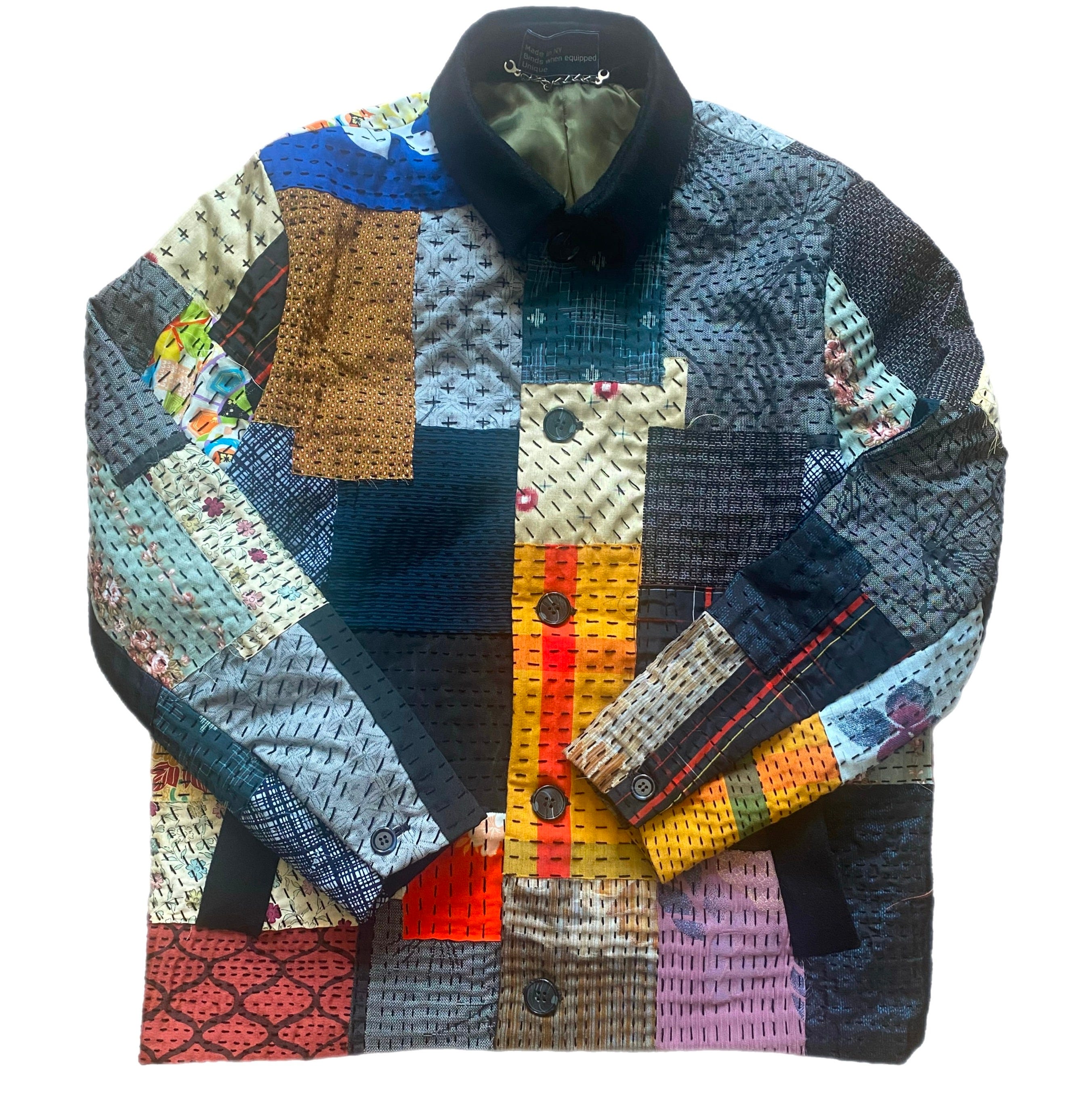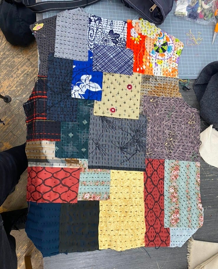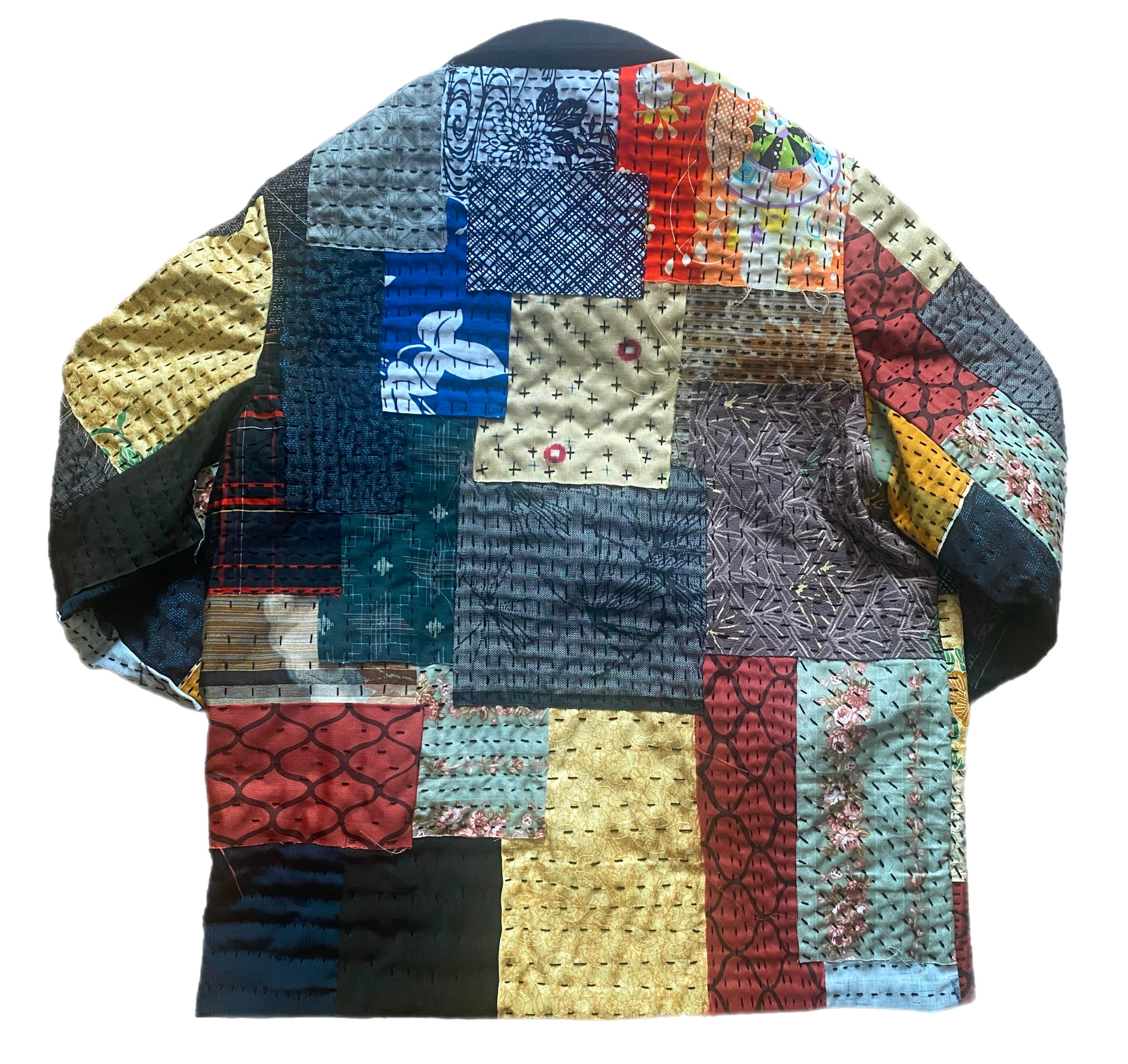 My initial idea to make a pair of patchwork shorts was out the window as these would need to be washed often and be durable. So after going back to the drawing board I decided on a jacket. I figured Like a Kimono the exterior of a jacket, fingers crossed, shouldn’t take as much wear as a garment closer to the body. Fingers extra crossed it shouldn’t get dirty and need washed or at least not at the same rate as other garments.