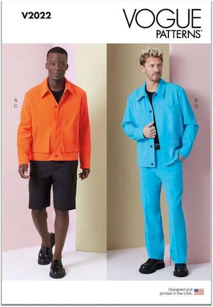 This was the pattern I used. I mean, once I saw that all blue fit I knew this was the one. I did make several changes however including a new collar, cuffs, pockets, lining and front button placket which you can see on the finished product.