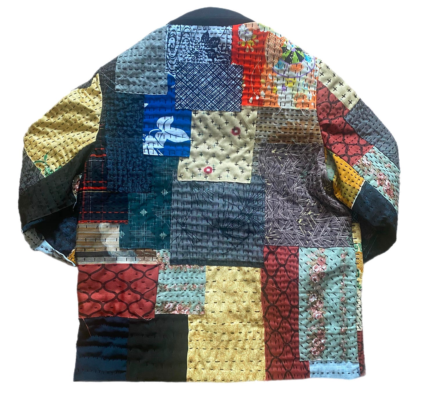 I cut each pattern piece out of black cotton canvas. Then for the next 4 months I attached the kimono scraps to the jacket pieces using a sashiko technique and thick cotton sashiko thread. I didn’t use any kind of guides or templates as I am much to lazy for that and also I wanted there to be an easily visible hand crafted quality to the jacket.
