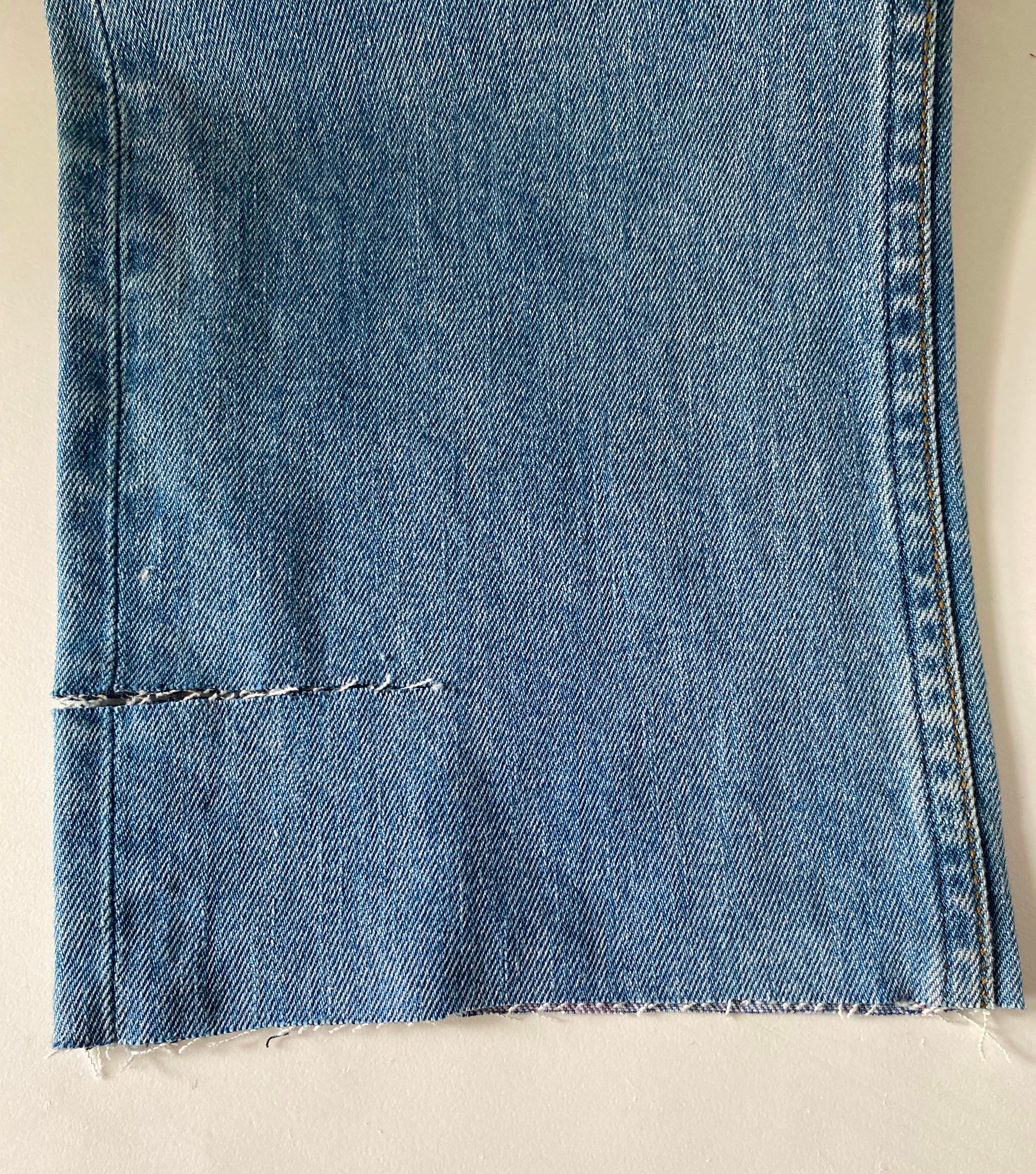 After panicking I finally came up with the above solution. I cut the spot out and sewed in a panel. Not particularly flattering and my friend definitely intends to wear these without a cuff or any breaks so it will probably be very noticeable. If this were my own pair of pants I wouldn’t have honestly cared that much. In fact for me it just adds character to a pair of pants thats now “customized”. But for my friend I knew this wasn’t what he was expecting. Luckily the pants were just American Apparel pants so I figure worst comes to worst I’ll just buy the pants off of him and use them in another project. So there is one benefit of most clothing being cheap and disposable 🙃.