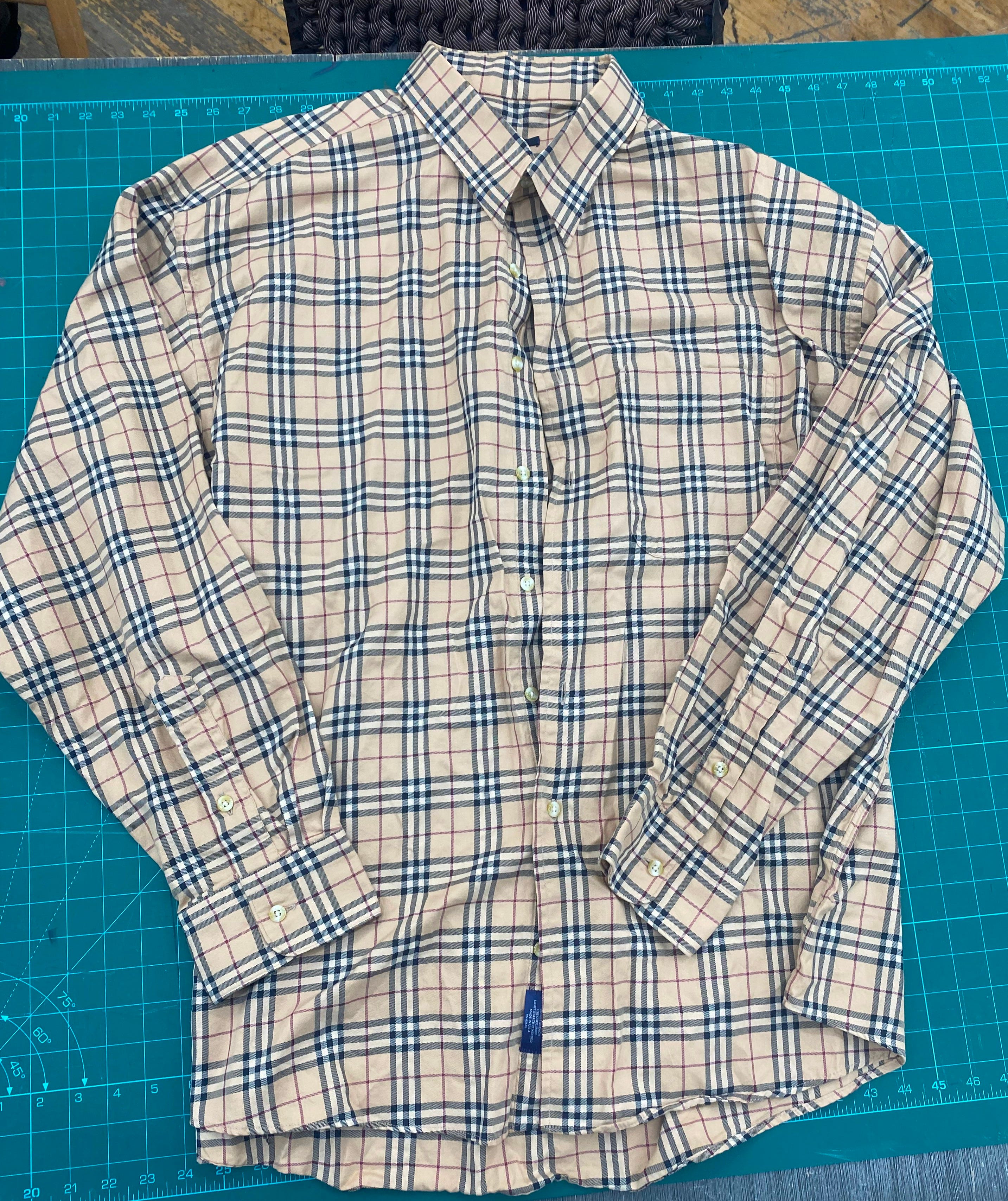 Now heres the big boy project that I had kind of been dreading, especially coming off of the jeans project. My friend bought this XXL Burberry shirt in the early 2000s when it was the trend to wear incredibly oversized things. He was absolutely swimming in this shirt and he asked me to take it in at the sides, shorten the arm holes, make it short sleeve, and bring up the hem. This is no easy task but it could have been worse.